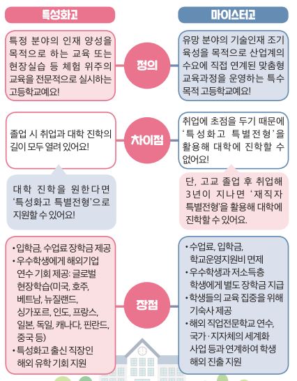자녀가 원하는 직업을 갖기 위해서 고교선택이 그 출발점이 될 수 있습니다. 자신만의 전문 분야를 키우는 것이 중요해지는 시대 흐름에 발맞춰 인재를 육성하는 특성화고·마이스터고에 대해 살펴봅시다.