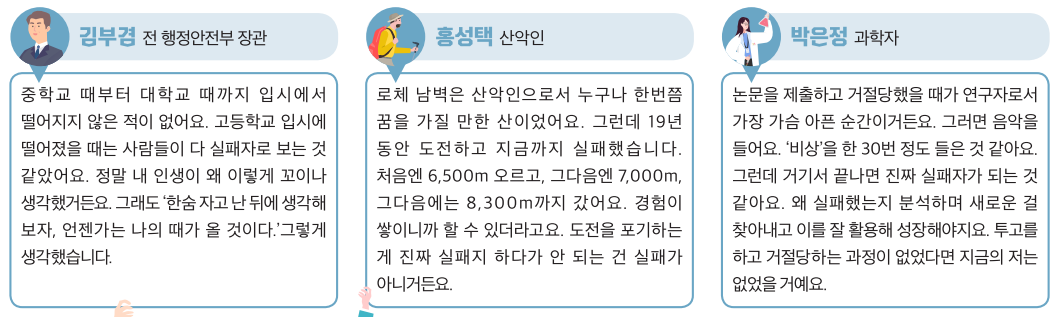 19년 동안의 실패를 극복하고 세계 최초 5극지 정복에 성공한 산악인 홍성택, 논문이 기대 수준에는 조금 모자라다는 평가를 받아 왔으나 수많은 수정과 도전을 거쳐 결국 세계 상위 1% 연구자에 선정된 과학자 박은정, 중·고·대학까지 모든 입시는 다 떨어지는 난관을 겪은 전 행정안전부장관 김부겸. 성공한 듯 보이지만 수많은 실패를 경험해 온 사람들이 털어놓는, 누구나 겪었지만 말하지 않았던 값진 실패 이야기를 자녀와 함께 살펴보며 실패를 자산으로 만드는 방법에 대해 생각해 봅시다.