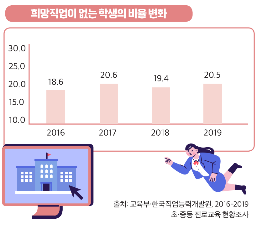 최근 4년간의 조사에 따르면 우리나라 고등학교 2학년 학생 중 희망 직업이 없는 비율이 약 20%대에 이르는 것으로 나타났습니다. 이러한 진로 미결정 학생들에게는 본격적인 진로역량 강화에 앞서 심리정서지원 및 자기계발을 위한 인지력과 행동력을 향상시키는 처치가 우선적으로 이뤄져야 합니다. 즉 ‘자기명료화’ 과정을 통해 스스로를 바라보는 관점을 건전하게 정립하고 자신의 진로 가치를 찾아나가야 하는 것입니다.
