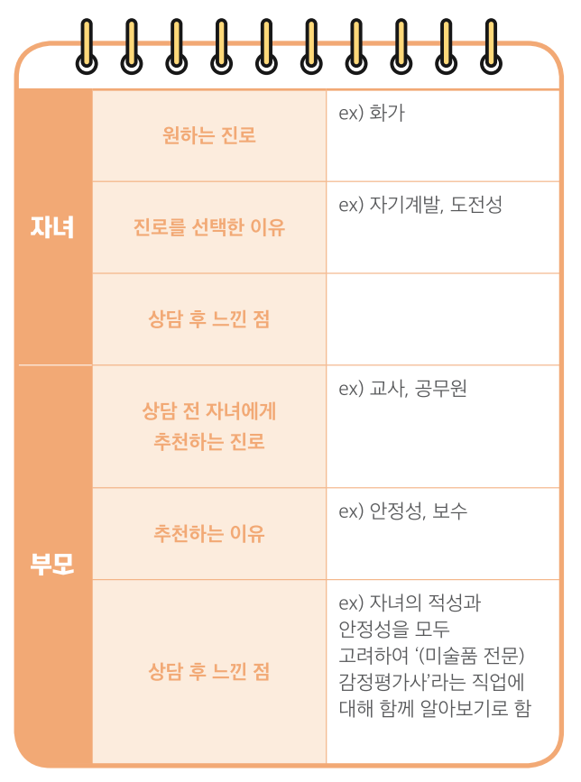 부모는 자녀가 무조건 꿈을 좇기보다는 경제적인 능력을 인정받으며 안정적인 생활을 하길 바라고, 자녀는 좋아하는 일을 중심으로 하고 싶은 일을 꿈꾸다 보니 학부모님과 자녀 사이에 의견 차이가 생기며 진로갈등으로 번질 수 있습니다. 갈등 해결이 필요할 경우 자녀와 함께 커리어넷 진로상담 기능 등을 활용하여 상담을 받아 보고 아래의 활동지를 작성해 대화를 나누며 서로의 입장을 조율해 봅시다.