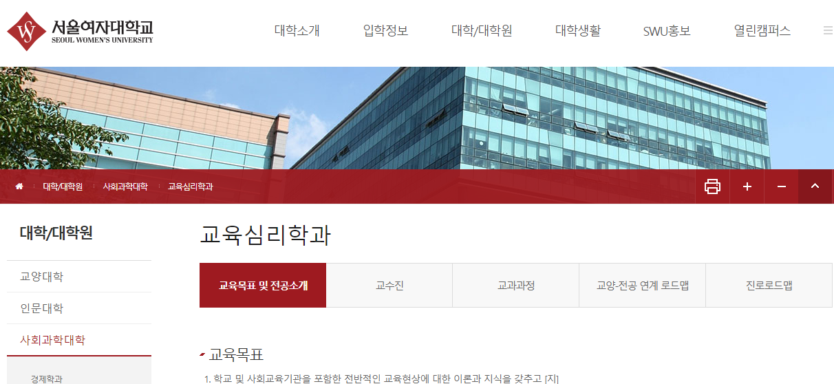 서울여자대학교 교육심리학과는 국내 유일의 교육심리학과로 교육 및 상담 관련 분야에서 실제적인 문제를 해결하는 지식과 인성을 겸비한 전문 인재 양성을 목표로 설립되었습니다. 본 학과에서는 인지발달과 정서지원을 통합하고 교육현상을 심리학적 이론과 방법을 적용하여 연구하고, 그 결과를 학교 및 사회현장에 적용하는데 주력하고 있습니다. 본 학과는 학습자 중심 맞춤형 교육과정 정비, 인간 이해와 상담에 필요한 교과편성 및 실습의 강화, 현장실습 및 자원봉사 활동, 각종 교육관련 프로그램의 개발 및 평가 기회를 확대함으로써 이론과 실무를 겸비한 교육심리 전문가를 양성하는 데 중점을 두고 있습니다.