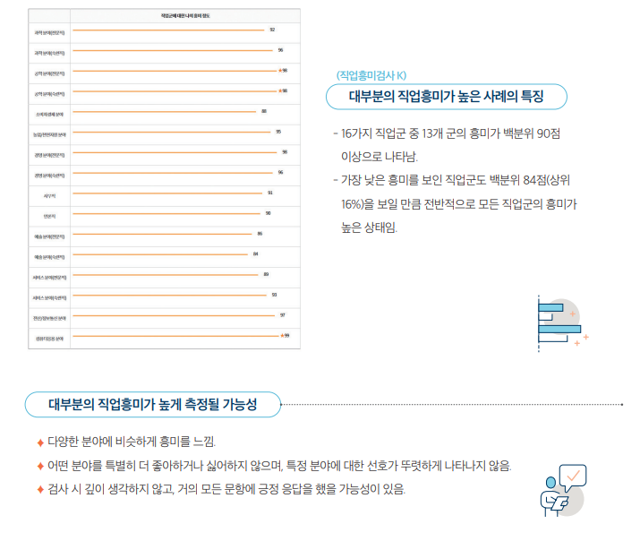 흥미 정도가 전체적으로 너무 높거나 너무 낮은 경우는 검사 시 환경, 응답 태도 및 방식 등을 먼저 확인해 볼 필요가 있습니다. 그리고 한편으로 더 좋아하는 것과 그렇지 않은 것을 구분하기 어렵다는 것을 의미할 수도 있지요.