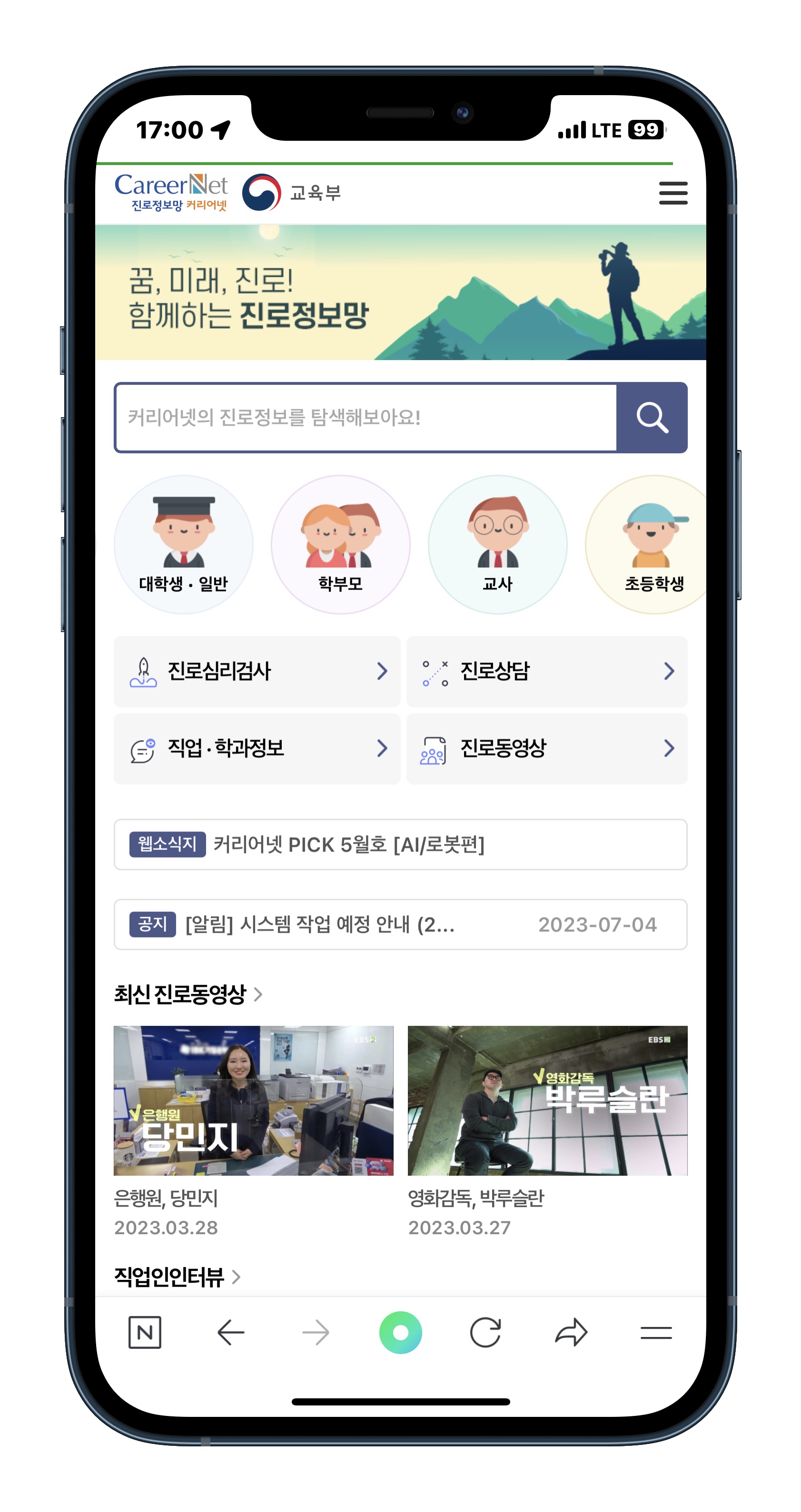 커리어넷의 주요 서비스를 모바일로 언제 어디서든 활용할 수 있습니다!