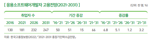 향후 10년간 응용소프트웨어개발자의 일자리는 증가할 것으로 전망된다. 「2021-2031 중장기인력수급전망」(한국고용정보원, 2022)에 따르면, 응용소프트웨어개발자는 2021년 약 181천 명에서 2031년 약 247천 명으로 향후 10년간 약 66천 명(연평균 3.2%) 증가할 것으로 전망된다.