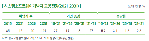 향후 10년간 시스템소프트웨어개발자(프로그래머)의 일자리는 다소 증가할 것으로 전망된다. 「2021-2031 중장기인력수급전망」(한국고용정보원, 2022)에 따르면, 시스템소프트웨어개발자 (프로그래머)는 2021년 약 112천 명에서 2031년 약 139천 명으로 향후 10년간 약 27천 명(연평균 2.2%) 증가할 것으로 전망된다.