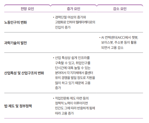 과거 콜센터 및 텔레마케팅 서비스업은 꾸준한 성장을 거듭해 종사자 수가 크게 증가하였으나, 2010년대 이후부터 증가세가 다소 주춤한 상태로 콜센터 및 텔레마케팅 서비스업이 포화상태에 이른 것으로 보고 있다. AI 발전 속도가 매우 빠르고 특히 음성인식 분야의 발전 속도가 매우 빨라 상당 분량의 일을 AI가 대체할 것으로 보인다. 단순 상담은 챗봇, 보이스봇, 주소봇 등과 같은 각종 봇으로 대체될 것으로 보인다. 일례로 114안내전화의 경우 인력의 90%가 줄어들었다.